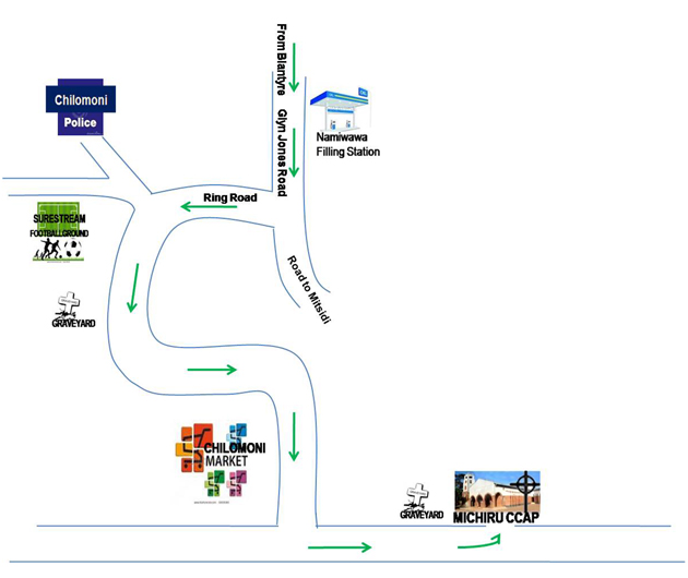 From Blantyre, at the top of Victoria Avenue (facing Mount Soche Hotel) turn left onto Glyn Jones Road towards the Hong Kong restaurant. Continue on Glyn Jones Road past the Hong Kong restaurant on your right and the road to Ryalls Hotel on your left. Proceeding along Glyn Jones Road you will enter Namiwawa and past a PUMA Filling Station on your left. Continue along Glyn Jones Road until you meet a sharp right turn with a large number of signposts arrayed in front of you. Take the tarmac road to your right and not the dirt road in front of you. Follow this road (The Chilomoni Ring Road) past several twists and turns as you enter Chilomoni. When you reach a T-junction turn left. Proceed downhill on this road past the graveyard on your left until you see a fence soon after the graveyard on the left. That is where you will find Michiru CCAP.